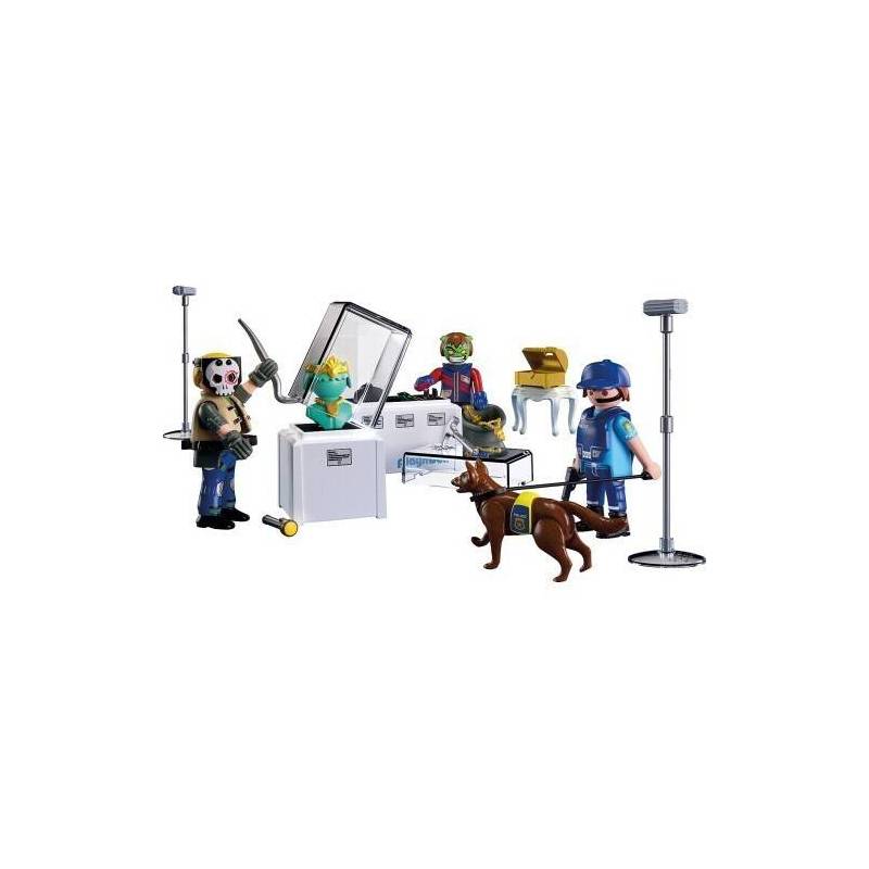 Τι είναι πάλι αυτός ο θόρυβος; Είναι κανείς εκεί; Ο αστυνομικός μπαίνει αθόρυβα στον εκθεσιακό χώρο του μουσείου για να ελέγξει. Όντως! Δύο μασκοφόροι διαρρήκτες έχουν επικεντρωθεί με τους λοστούς τους στις βιτρίνες και έχουν βάλει ήδη ένα μέρος από τη λεία στον σάκο τους. Αρχίζει ένα γρήγορο ανθρωποκυνηγητό. Οι δύο κλέφτες προσπαθούν βιαστικά να κατέβουν από το σχοινί τους. Αλλά ο σκύλος φύλακας είναι ήδη μια ανάσα από τα ίχνη τους. Θα καταφέρουν να ξεφύγουν; Μια τολμηρή διάρρηξη κάτω από το φως της νύχτας – αυτή είναι η ληστεία διαμαντιών της Playmobil.